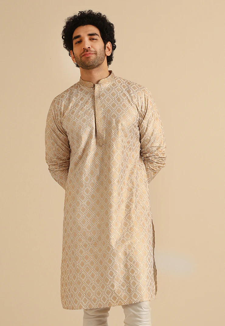 Beige Silk Blend Kurta with Intricate Woven Design and Mandarin Collar