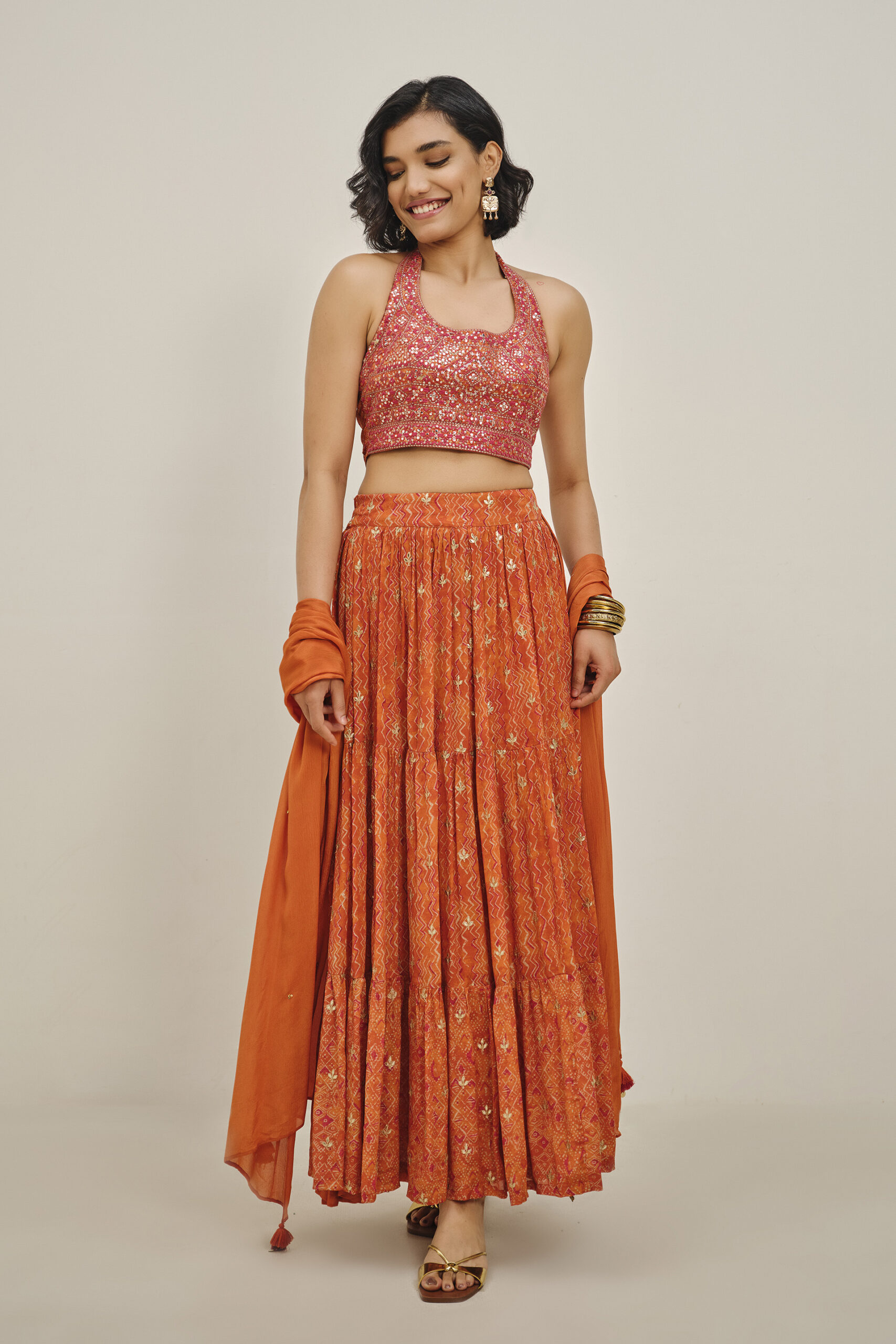 Make every moment a celebration with this three-piece set. The halter crop top, flared skirt, and flowy dupatta shimmer with embroidery that catches every light. Made for dancing through mehendi nights and music-filled hours.