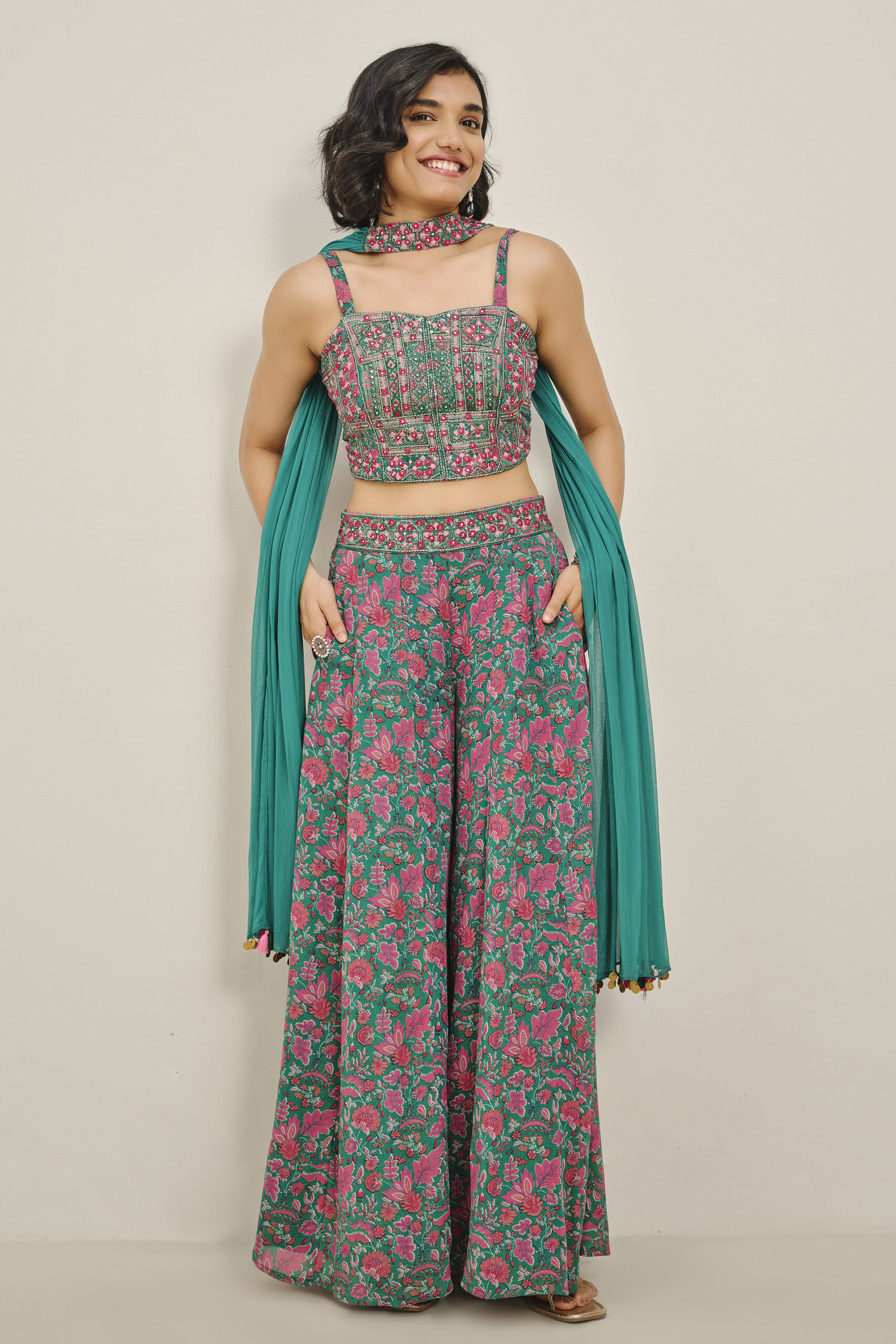 This set brings festive charm with its flared palazzo pants, sleek crop top and co-ordinating jacket. Designed in viscose, the sleeveless silhouette with delicate straps makes it perfect for weddings, sangeet nights and special celebrations.